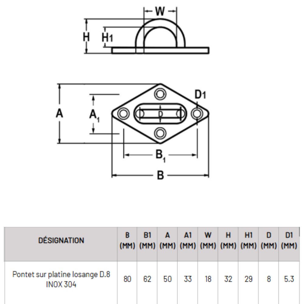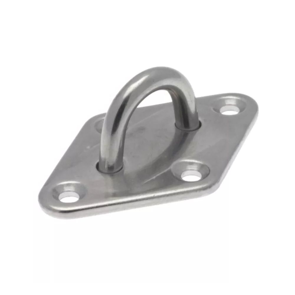 Sa platine en forme de losange permet une fixation solide à l’aide de vis ou de tirefonds, tandis que l’anneau central sert de point d’accroche pour le mousqueton.
